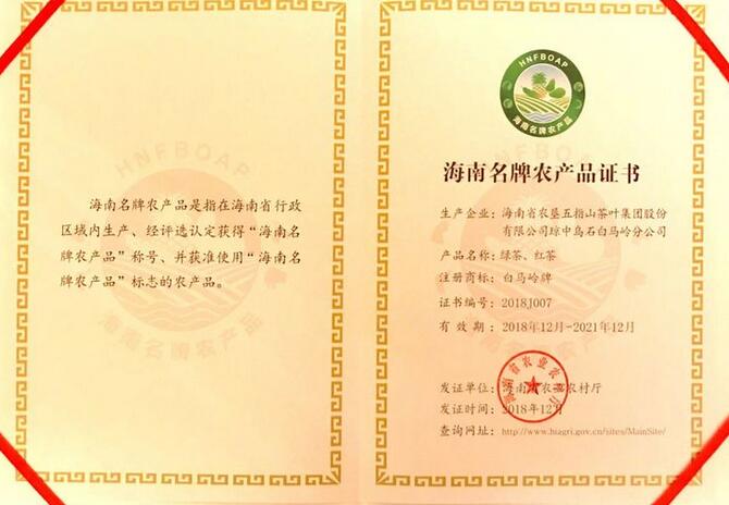 近日,海墾茶業(yè)集團(tuán)瓊中烏石白馬嶺茶業(yè)分公司生產(chǎn)的白馬嶺牌紅茶、綠茶被海南省農(nóng)業(yè)農(nóng)村廳評定為海南名牌農(nóng)產(chǎn)品并頒發(fā)證書,證書有效期201812月至202112月。
