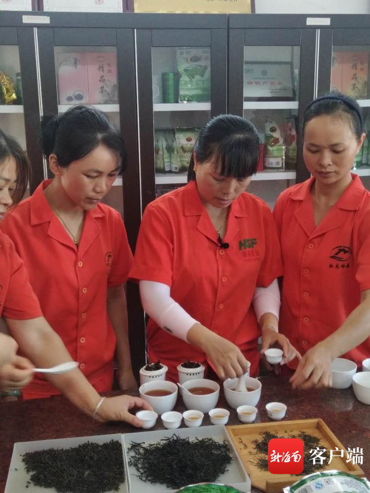 符小琴(中)與工友們品鑒研制茶葉。海墾茶業(yè)集團供圖