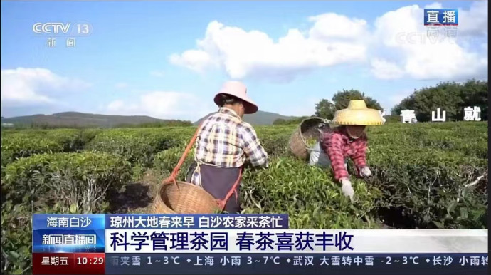 1月28日海墾熱作旗下白沙綠茶走進央視《新聞直播間》,瓊州大地春來早,白沙農(nóng)家采茶忙。