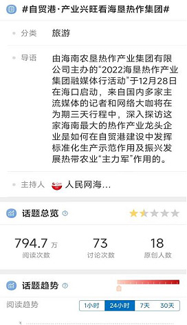 12月29日海墾熱作集團攜手人民網(wǎng)、央視網(wǎng)和一眾網(wǎng)絡大V啟動“產(chǎn)業(yè)興旺看海墾熱作集團”行動,三天兩晚走遍熱作基地。期間原創(chuàng)文章50余篇,兩次在人民網(wǎng)官網(wǎng)首頁推薦并獲英文版轉(zhuǎn)發(fā),人民網(wǎng)微博瀏覽量近800萬次,全網(wǎng)曝光近億人次。