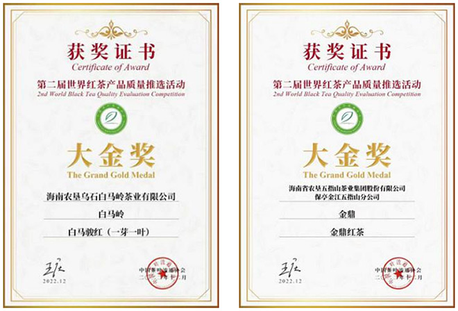 2022年12月白馬駿紅(一芽一葉)、金鼎紅茶榮獲第二屆世界紅茶產(chǎn)品質(zhì)量推選活動大金獎