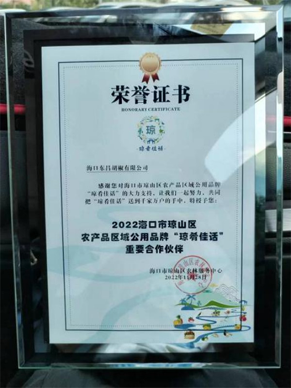 11月28日東昌胡椒公司被評為2022??谑协偵絽^(qū)農(nóng)產(chǎn)品區(qū)域公用品牌“瓊肴佳話”重要合作伙伴。