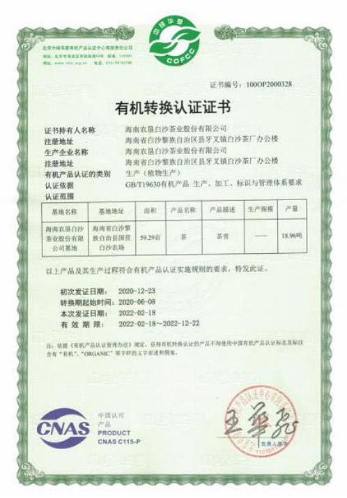 2022年2月榮獲“有機轉(zhuǎn)換認證證書”