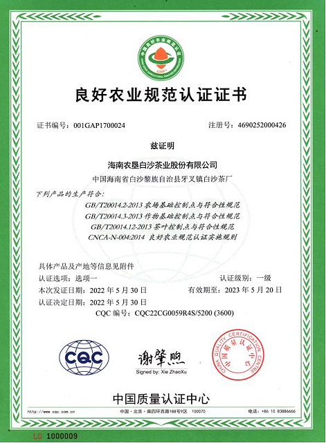 2022年5月榮獲“良好農(nóng)業(yè)規(guī)范認證證書”