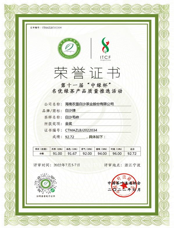 2022年7月白沙毛峰榮獲中國茶葉流通協(xié)會第十一屆“中綠杯”金獎