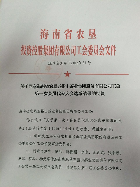 成立海南省農(nóng)墾五指山茶業(yè)集團(tuán)股份有限公司工會(huì)委員會(huì)和工會(huì)經(jīng)費(fèi)審查委員會(huì)的批復(fù)
