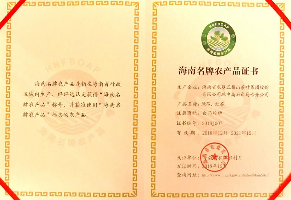 白馬嶺牌紅茶、綠茶被評定為“海南名牌農(nóng)產(chǎn)品”